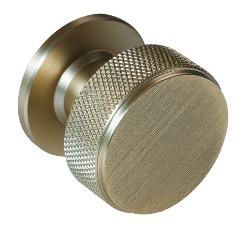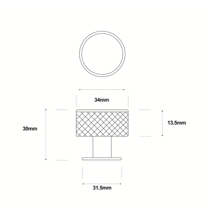 Part of knurled cabinet collection, overall length of 34mm, 30mm projection and 31mm diameter base.