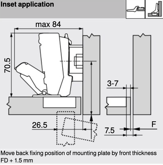 Dual hinges can be converted into inset by using 8mm spacing mounting plate