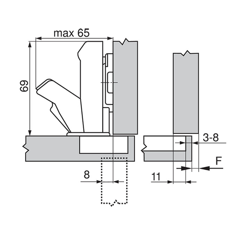 Its trusted slide-on and screw-fix mechanism guarantees a secure fit, while the integrated pull-out stop offers added safety against accidental door detachments during assembly or adjustments.With its 3-dimensional adjustment, ensure every door displays impeccable gap alignment, reflecting Blum’s commitment to precision and quality.