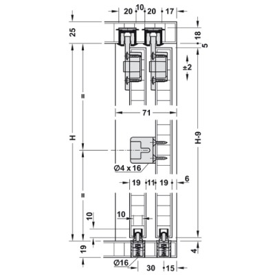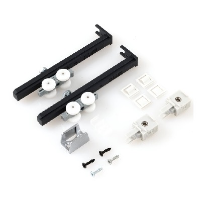 Fitting for 2 top-running wooden doors up to 36 kg, with screwed on or groove mounted running track.