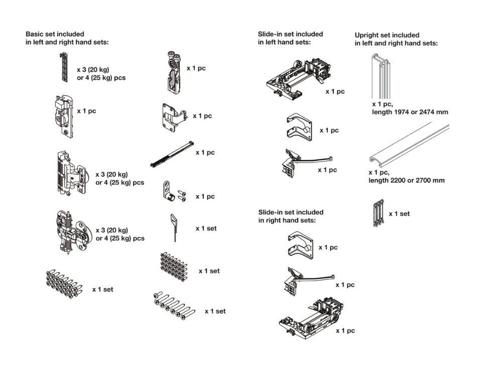 Sets are handed left and right and available for door heights of 1200-2200 mm (20 kg) and also 1900-2700 mm (25 kg). Top track and bottom profile are fitted easily from the front