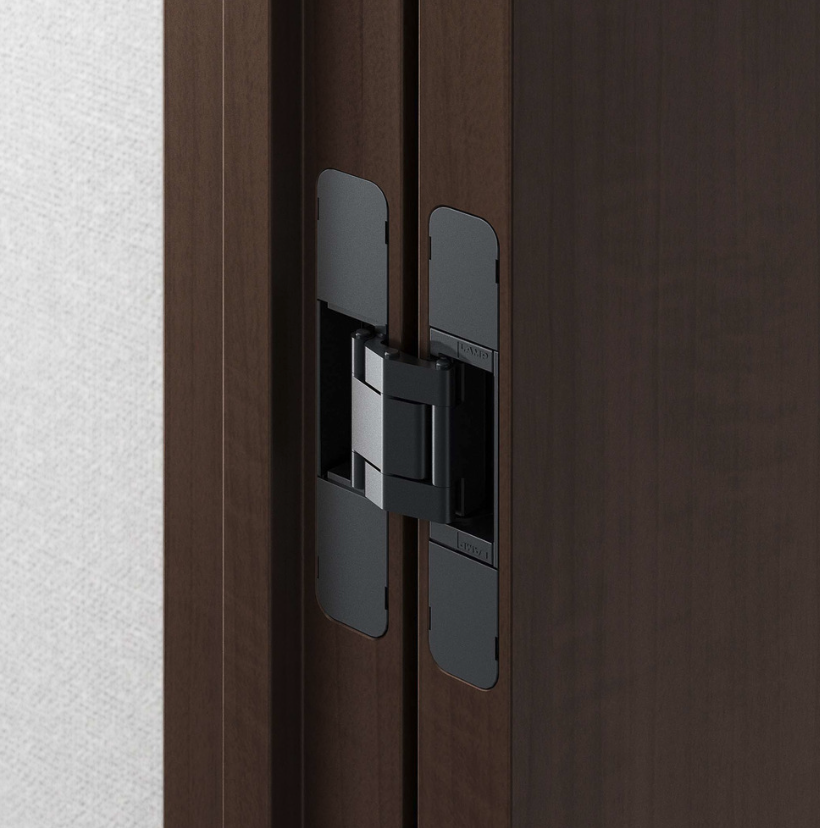 Concealed hinges are installed within the door and frame, providing a clean and minimalist look.