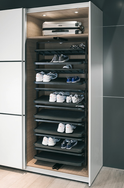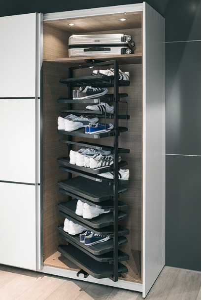 When the shoe rack is rotated around its axis, the mechanism also ejects it outwards, creating an efficient storage system for your shoes.